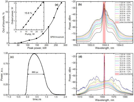 Self-phase modulation (SPM) and FWM are the main nonlinear effects that limit the peak power of sub-ns pulses. Therefore, we used an optical spectrum analyzer (OSA) to assess their thresholds. The effect of self-phase modulation is best seen at the highest spectral resolution (see Figure 3b). Exceeding the SPM threshold results in broadening of the pulse spectrum near the operating wavelength. Since the time-limited spectral bandwidth of sub-ns pulses is much lower than the highest spectral resolution of our OSA, we chose spectral bandwidth of 0.04 nm (2× spectral resolution), which corresponds to a −20 dB bandwidth of the original pulse. We calculated the fraction of the output power outside the pulse boundaries for each pump power and subtracted the value at the lowest pump power, which corresponds to the spectral noise in the input signal (this did not affect the calculation of pulse energy and peak power). At pump powers higher than 18 W, the pulse bandwidth increases dramatically; thus, we consider that to be the SPM threshold in our experiment. At 18.8 W of pump power, the output power was 2.06 W, which corresponds to a pulse energy of 183 µJ and peak power of 211 kW at the SPM threshold. Another nonlinear effect that we have observed in the system is FWM. FWM causes new peaks to appear at significantly different from the main peak wavelengths. Figure 3d shows that at pump powers over 18.8 W, additional peaks arise in the output spectra. However, according to the integral measurements similar to the ones for the SPM but with a spectral bandwidth of 2 nm. the intensity of the process is an order of magnitude lower. Thus, the main limiting factor for sub-ns peak power scaling of the T-EDF is the SPM with a threshold of ~200 kW.
