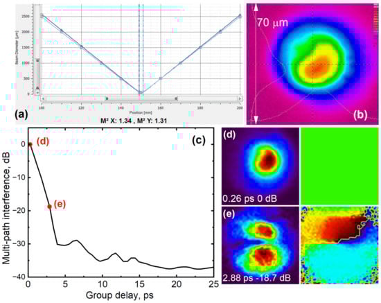 To evaluate the spatial beam characteristics of the manufactured T-EDF, we carried out several measurements with a CW input signal with a central wavelength of 1560 nm and a pump power of 17 W (output power ~2.5 W). The M2 value of the output beam was 1.34/1.31 for the x and y axes correspondingly (see Figure 4a), which indicates near-diffraction-limited beam quality and single-mode operation. To further verify the single-mode performance, we measured multipath interference using the S2 measurement technique with single-mode scanning optical fiber [25,29]. As shown in Figure 4c, the multipath interference (MPI) plot exhibits several peaks, but the only meaningful peak is the one with a delay of 2.88 ps and a −18.7 dB MPI corresponding to the LP11 mode (see Figure 4e, where retrieved intensity and phase correspond to the LP11 mode). This confirms the single-mode operation of the T-EDF.