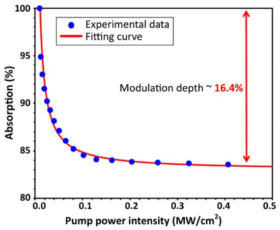 The twin detector method was used to obtain the results for material saturable absorption as in the previous work [36]. This method is a characterization technique that is used to obtain saturable absorption properties for all saturable absorber materials. In our work, CNT was the SA material utilized in the experiment. The experimental data of the material saturable absorption are shown in Figure 1, where the dotted mark represents the experimental value for the modulation depth of CNT thin film, while the linear line represents the fitting curve based on the characterization of the modulation depth for the twin detector method. The calculated values of the modulation depth (α0), the saturation intensity (Isat) and the non-saturable absorption loss (αns) can be obtained after fitting the formula in Equation (1) based on the modulation depth numerical study [37]: