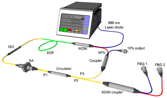 - Gao, S.; Luo, M.; Jing, Z.; Chen, H. A tunable dual-wavelength fiber ring-cavity laser based on a FBG and DFB laser injection. Optik 2020, 203, 163961. [Google Scholar] [CrossRef]