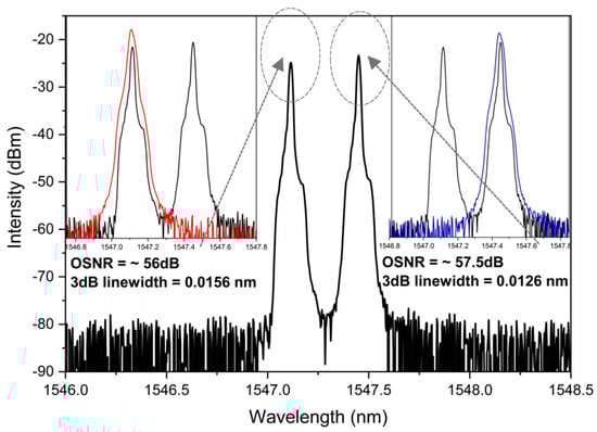 The dual-wavelength Q-switched fiber laser output, as illustrated in this Figure 4, was initiated from the two FBGs that are being manipulated using the tunable FBG device. The red colour line at a shorter wavelength originated from the actual FBG’s wavelength at 1547.12 nm (FBG 1). In contrast, the blue colour line at a longer wavelength is the wavelength that was tuned using the tunable FBG device at 1547.45 nm (FBG 2). The blue colour lasing represents the maximum wavelength tunability, since the stretch and compression of the FBG reached their limit. The dual-wavelength spectrum, represented by the black line in the figure, appears from the combination of two laser lines, represented in the figure by the red and blue colour spectra. It was ensured that both FBGs were monitored at room temperature with no substantial temperature fluctuation. The dual-wavelength spectrum, indicated by the black line in the spectrum, results from the combining of two laser lines (red and blue). The distance between two lasing lines can be increased by regulating both FBGs with two metal blocks. The 3 dB line widths of the dual-wavelength output are 0.028 nm at 1547.12 nm (shorter wavelength) and 0.031 nm at 1547.45 nm (longer wavelength), coming from FBG 1 and FBG 2, respectively. The optical signal-to-noise ratio (OSNR) values of the dual-wavelength are 56.0 and 57.5 dB for the shorter wavelength and longer wavelength peaks, respectively.