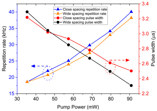 The pulse characteristics of the Q-switched fiber laser, such as pulse repetition rate and pulse width for both close and wide spacing, are plotted as in Figure 7. The increase of repetition rate from 18.6121 to 40.0664 kHz depends on the increasing pump power from 35.30 to 90.88 mW, with corresponding decreasing pulse width from 3.22 to 2.504 μs for close spacing dual-wavelength output. Whereas the increase of the repetition rate from 18.58 to 38.21 kHz depends on increasing the pump power from 35.30 to 90.88 mW, with corresponding decreasing pulse width from 3.29 to 2.31 μs for wide spacing dual-wavelength output. The nonlinear dynamics of the EDF and the SA are interconnected according to the dynamics of the energy provided by the pump power. As the pump power increases, more gain will result to saturate the SA. In addition, the threshold energy stored in the amplification medium (EDF) can also be reached more quickly to produce pulses. As a result, pulses are produced quicker. This, thus, brings about a decline in the pulse width, as the speed of the pulse creation becomes faster. On the other hand, increasing the pump power increases the repetition rate, as more longitudinal modes can pass the threshold of the Q-switching process and locked together, producing a higher repetition rate of the Q-switched output [49]. The pulse width obtained from the experiment could be further narrowed by optimizing parameters such as cavity length, modulation depth or minimize the losses in the cavity [50].