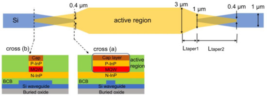 The III-V taper is used to couple light adiabatically from the MQW region to the Si waveguide, with no significant reflections to avoid inducing the multi-cavity effect [28], except for the Bragg and Fano mirrors etched on the silicon layer. Then, we need to minimize the coupling loss between the active region and the silicon waveguide, as shown in Figure 6, where the InP layer is adhesively bonded by Benzocyclobutene (BCB, n = 1.57) to the Si wafer with a spacing distance of 80 nm. Since the waveguide widths of the two tapers vary along the propagation direction, both of the propagation coefficients become equal at certain position, where their effective refractive indices of the guide-modes match. By sweeping the taper1/taper2 length by the eigenmode-expansion (EME) method, the optimum lengths are designed as and , with 98.8% and 96.7% for the coupling efficiencies, as illustrated in Figure 7a,b, respectively.