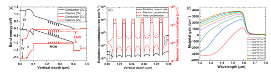 For the active region, InAlGaAs/InP MQWs are used with the detailed parameters as listed in Table 1. The band structures of gain region under 0 and 2 V bias voltages, as well as the carrier concentrations and radiative recombination, are calculated using the Silvaco Atlas package [29], as shown in Figure 9 a,b. The material gain curves for the MQWs at different carrier densities are plotted in Figure 9c, such that the gain coefficient () is chosen to be 3800 cm−1 at 1.5 μm, as in Table 2, for our next-step laser simulations. The MQW modal gain is given by , where is the confinement factor, is the gain saturation coefficient, and is the photon density.