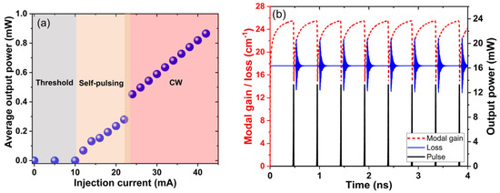 (a) Time-averaged power versus injection current for the proposed laser, and (b) modal gain/loss with pulsed output power at I = 16 mA.