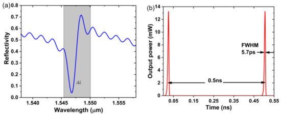 Here, the saturable absorption will dynamically change the Q-factor of the laser cavity and resonant frequency of the micro-ring at different incident optical power. The RH-induced Fano response provides a sharp variation of the reflection at different wavelengths, as indicated by the grey region in Figure 11a, such that the laser can be tuned at GHz rate by the high-speed switching of the Fano mirror resonance condition. The optical fields in the cavity interact with the injected carriers dynamically [32], i.e., spontaneous noise of the laser can perturb the device away from the quasi-equilibrium state, such that if the optical power is increased by the small noise, more carriers will be absorbed, leading to a reduced loss. This will positively feedback to the cavity, and the optical field further increases to consume more carriers until absorption saturation, which depletes the carriers instantaneously (in picosecond scale) when reaching the optical peak. However, the lowered material gain smaller than the total loss and the shift of resonance wavelength away from Fano reflection peak would rapidly turn off the pulse until enough carriers are accumulated for the next round pulsing [33]. Therefore, the combination of Fano switching and the SA effect can generate ps-pulsation iteratively and self-sustainably, as shown in Figure 11b. Here, the FWHM of the pulse is around 5.7 ps, and the repetition period is about 0.5 ns (i.e., 2 GHz).