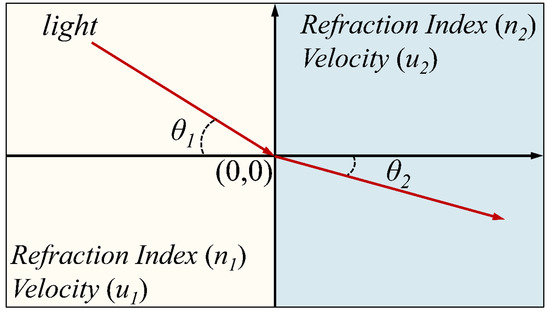 Diagrammatical representation of the refraction of light. A beam of light passes through a medium with refraction index n1, to a new medium with refraction index n2. The angle of incidence at point (0,0) is θ1, while the angle of refraction is θ2 (adapted and reproduced from https://en.wikipedia.org/wiki/Refraction, accessed 6 May 2021).