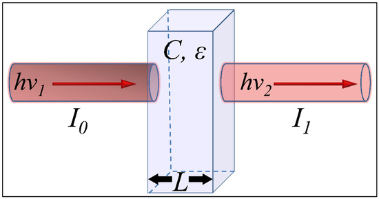 Simplified representation of Beer–Lambert theorem principle and measurement of nucleotides with respect to their absorption—incoming light (hv1) with intensity I0, travels through a path (L), which goes through a solution with concentration (C) and extinction coefficient (ε), and exits the solution (hv2) with intensity I1.