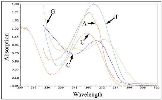 Determining the concentration of nucleotides in a solution is important to a variety of experimental procedures in biology. For example, RNA plays an essential role in the regulatory paths of biological entities, but is considered to be one of the more difficult molecules to keep intact (due to the abundant presence of RNases). Measuring RNA concentration after extraction from biological samples can be accomplished by spectrophotometry. In Figure 5, the absorbance spectra of the five nucleotides are presented (adenine (A), cytosine (C), thymine (T), guanine (G) and uracil (U) (Figure 6)), reproduced with the help of the PhotoChem CAD software [79,80,81]. Moreover, Figure 7 presents in-house spectrophotometric measurements of total RNA (unpublished data).