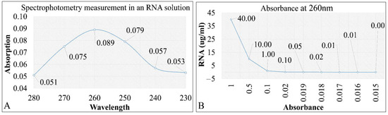 Two in-house evaluations of RNA absorbance with respect to the wavelength (A) and absorbance with respect to RNA concentration (B).