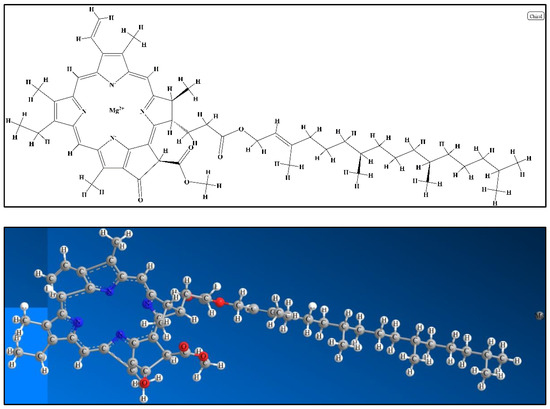 The molecular structures of chlorophyll a in 2D (upper) and 3D (lower).