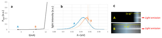 (a) Power-current curve of a DFB laser emitting at 1300 nm; (b) normalized spectra measured at 3 mA (A) and 9 mA (B) in the sub-threshold range; (c) graphical representation of cases A and B based on a real TEM cross-sectional image of a MQW DFB laser diode. In case A the inner part of the optical cavity does not contribute to the measured light emission. In case B the periodic grating is involved enough to cause the interference peak observed in the spectrum.