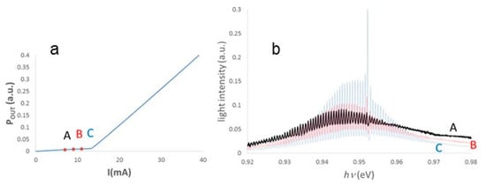 (a) Power-current curve of a DFB laser emitting at 1300 nm also with FP resonances; (b) spectra measured at 7 mA (A), 9 mA (B), and 11 mA (C), each rescaled in order to appreciate the ratio between baseline and modulation. For all spectra, no resonances appear in the low-intensity range at high photon energy.
