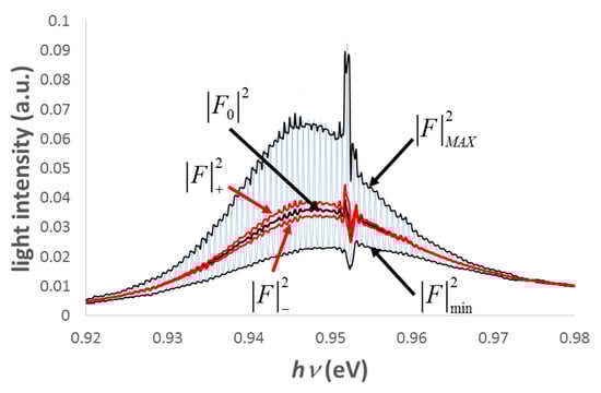 Integral methods, on the contrary, follow the roadmap indicated by Cassidy [43] and numerically calculate the integral of Equation (17) over one spectral range, which means a moving average over one period of the cosine function. Let us define it . The original method of Cassidy then calculates the ratio , and gets the same quantity ρ as for the Hakki–Paoli method. The advantage in this case is that the smoothing of maxima introduced by the experimental equipment is no more a concern, so that extreme resolution is no longer required for gain measurements.