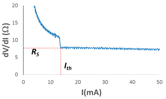 Plot of the dV/dI values for the same laser diode of Figure 2. The coordinates of the sharp transition individuate the threshold current Ith and the series resistance RS. Note: The small decrease of the dV/dI curve after the threshold is due to geometric effects (progressive widening, after threshold, of the area of the inverted region), analyzed and explained in ref. [67]. On a practical note, it is the RS value measured at threshold to be considered.