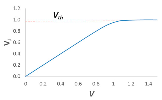 Plot of the internal voltage VJ as a function of the applied voltage V. Internal voltage saturates at the threshold voltage Vth.