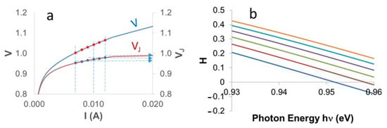 It is not usual to refer the performances of a laser diode to the applied voltage V; it is the forward current I that instead plays that role: spectra in Section 3, Section 4 and Section 5 have been identified by the corresponding current, and LI curves as in Figure 1a, Figure 2a, and Figure 18 have the current I on their abscissas, and the laser threshold is identified by the threshold current Ith. It seems then advisable to develop an alternative formulation of the proposed methods based on the current I instead of the voltage V by means of a suitable I(V) relationship for a laser diode. This has been one of the main tasks of the laser model developed by the author in previous years in the reference papers for this appendix.