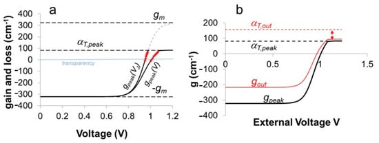 The physically sound relationship between optical gain and injection level in a laser diode is given by the Lasher and Stern formula [15] that here appears in the form of Equation (21) after replacing the quasi-Fermi levels with the internal voltage VJ, Equation (19), proposed by Barnes and Paoli [39]. The simplifying approximation of Equation (22) has been proposed and used by the author in all his papers [55,56,57,58,59,60,61,62,63,64,65,66,67,68,69] for the sake of referring elusive quantities as the electron and hole energies and densities to the measurable alternative quantities hν and qVJ. The result is that Equation (21) becomes a supplementary independent expression for optical gain that, coupled with any of the other measurement methods resumed in Section 3 and Section 5, leads to the separate measurement of gain and losses.