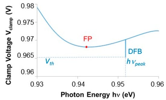 where is the photon energy at the spectral peak. That peak photon energy is that value of hν that leads the denominator in Equation (A3) to vanish for the minimum value of qVJ, which corresponds to the condition for voltage clamp introduced in Equations (26) and (27).