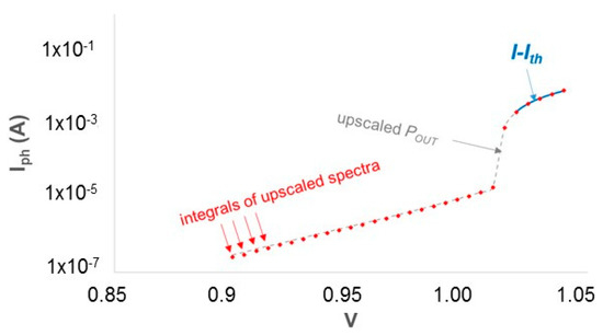 In a real device, extra currents flow at low bias, mostly due to the lateral sides of the active region, and become negligible as bias approaches threshold. Additionally, a series resistance, typically of a few ohms, plays a role, masking the ideal vertical transition shown in Figure A1 and reconstructed from experimental data in Figure 19.