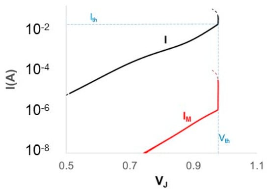The crucial point is the suitability of an ideal Shockley relationship, as in Equation (A2) and in the sub-threshold behavior of Equation (A3), to represent the I(V) characteristics of a real device. In particular, experiments almost never show an ideality factor equal to unity. In other words, the measured currents in the subthreshold range seem to follow the reduced bias VJ/N, with N > 1.