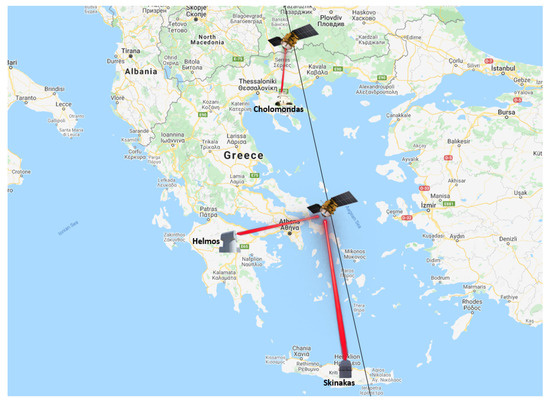 Through our analysis, we assumed that three astronomical observatories in Greece communicate with the LEO satellite constellation. The first is located in Skinakas (South, longitude: °, latitude: 24.8981°) at a height of 1750 m, the second in Helmos (Middle, longitude: 37.9855°, latitude: 22.1984°) is at a height of 2340 m, and the third in Cholomondas (North, longitude: 40.3419°, latitude: 23.5060°) is at a height of 850 m. These three observatories are involved in Greek QCI, which aims to build a secure communication infrastructure by exploiting the terrestrial fiber segments for quantum key delivery in users [31]. The location of each OGS is shown in Figure 1.