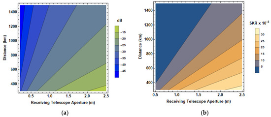 As we have already discussed in the introduction section, fiber QKD links are limited to few hundreds of kilometers due to the photon loss imposed by the fiber medium. When light propagates through empty space, none attenuation mechanism is present and therefore longer distances can be reached. On the other hand, other factors should be considered that lead to increased transmission losses, such as free-space loss. In order to minimize the geometrical loss, narrow beam divergences and large receiver apertures can be used. Aside from the loss mechanisms, the effect of the solar background noise during the day can significantly degrade the transmission performance. To combat this effect, ultra-narrow band-pass filters can be used to minimize the background noise to acceptable levels and isolate the quantum passband. Following the above approach and by using state-of-the-art equipment in both the satellite and the ground station, links up to GEO distances can be achieved [56]. Figure 2a shows the total downlink loss of the link including the quantum efficiency of the detectors, the setup loss of Bob station, the absorption and geometrical loss, the scintillation effect loss, pointing loss, and polarization decoherence loss. Figure 2b shows the SKR as a function of receiving telescope aperture and link distance under nighttime conditions.