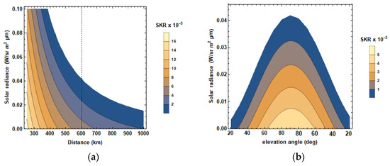 (a) Normalized SKR (bps/pulse) over solar radiance (watt/srμm) over distance (km). (b) Normalized SKR (bps/pulse) over solar radiance (watt/srμm) over elevation angle (deg) for a satellite orbit altitude of 600 km.