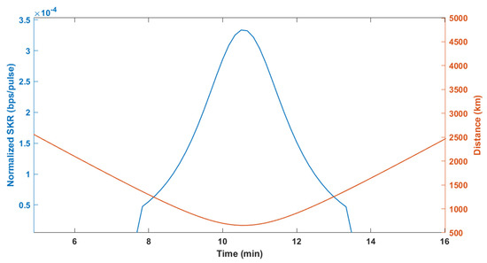 The duration of this single pass was found to be 340 s or 5.7 min. The maximum SKR value that was obtained was bps/pulse, which corresponded to the maximum elevation angle of . The total number of key bits that were distilled from this single pass, assuming a 100 MHz Alice’s repetition rate [25,26], was about 1.99 Mbits. It should be mentioned that the elevation angle of the satellite may differ from day to day, since the satellite does not always follow the exact same path over the OGS. Therefore, the satellite can be visible for either shorter or longer time lapses.