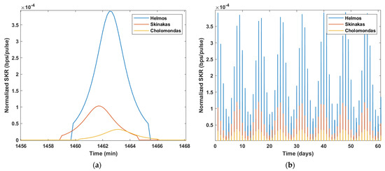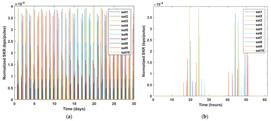 (a) Normalized SKR (bps/pulse) over time for a period of 1 month between the satellite constellation and the OGS of Helmos. (b) Normalized SKR (bps/pulse) over time for a period of 60 h between the satellite constellation and the OGS of Helmos.