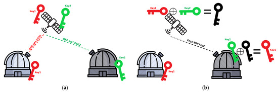 (a) Key exchange between the satellite and two optical ground stations (OGSs). The satellite establishes two QKD links for each OGS. (b) The satellite sends Key1 ⊕ Key2 to OGS2 with classical data communication. OGS2 uses Key2 to acquire Key1.