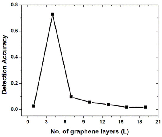 Because graphene is a lossy material, it should decrease the DA of the probe, as observed in Figure 3. The DA is optimal for four layers of graphene. The simulations for DA calculations were performed for an analyte refractive index of 1 RIU.