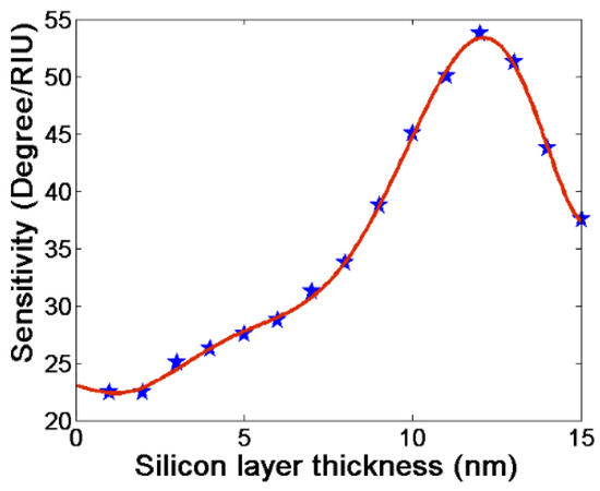 To optimize the thickness of the silicon layer, we fixed the thickness of the Au layer at 50 nm, used the optimized 13 layers of graphene, and varied the thickness of the silicon to see the sensitivity variation in Figure 4. The maximum sensitivity of 53.75 degree/RIU is observed for a 12 nm thickness of silicon. Thus, the optimized design for gas sensing is Au (50 nm)/graphene (13 layers)/silicon (12 nm), with a sensitivity of 53.75 degree/RIU.