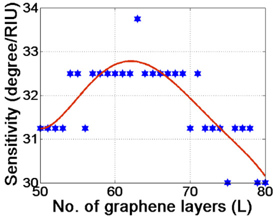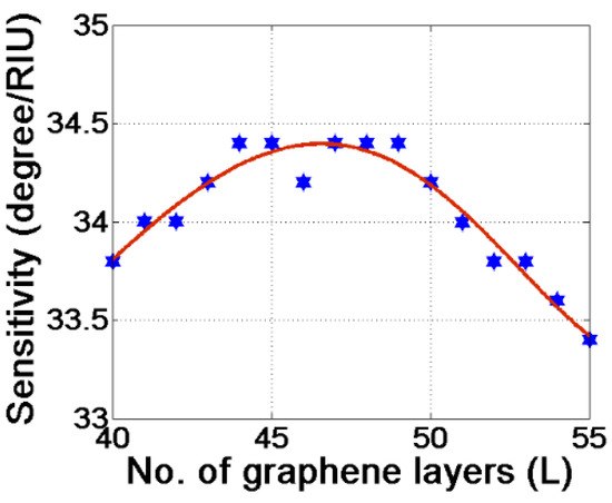 In Figure 2, we have plotted the sensitivity versus the number of graphene layers deposited over the Au coated GaP prism. To start with, the silicon layer thickness is taken to be 11 nm. It is observed that, as we increase the number of graphene layers, the sensitivity of the sensor increases up to a particular number of graphene layers and then it saturates for a certain range of graphene thicknesses (L = 13 to 17), and afterwards it decreases. We chose 13 layers of graphene as the optimum number for our design. Note that using thermal evaporation or sputtering coating machines, we can deposit silicon layers at a nm level thickness [19,23]. Normally, a thickness monitor equipment unit is attached to this coating machine, which accurately measures the layer thickness.