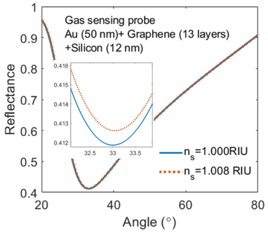 The SPR curve for an optimized bio-probe with Au (50 nm)/graphene (four layers)/silicon (12 nm) is shown in Figure 12.