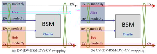 (color online) Schematics of entanglement swapping assisted by hybrid DV-CV entanglement: (a) DV-(DV-BSM-DV)-CV swapping and (b) CV-(DV-BSM-DV)-CV swapping.