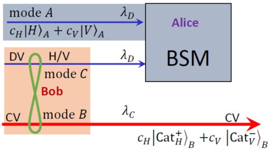 To obtain the state (1), we are interested in the simple optical circuit illustrated in Figure 1, where Alice (denoted by A hereafter) and Bob (B) are, respectively, using DV and CV encodings for QIP. In order to establish the internode link, they start with locally prepared nonclassical light states. Specifically, through spontaneous parametric down conversion (SPDC) [26] or spontaneous four-wave mixing (SFWM) [27], a two-photon polarization entangled state (or Bell state) is employed at Alice’s side, where subscripts ’a’ and ’b’ indicate the spatial modes of paired photons; whereas a polarization-coupled Schrödinger cat state is adopted on Bob’s site, which can be attained with a two-mode squeezed vacuum state [28] in an excellent approximation. A small fraction of light in (on average one photon) is tapped off by a beam-splitter (BS) with amplitude reflectivity , and the state then evolves to with and being the annihilation and creation operators for modes c and d. Please note that . On Alice’s node, meantime, a polarization beam-splitter (PBS) is applied to direct the photon in mode b into a center station where it is superposed with the subtracted photon in mode d for a joint BSM. It is not difficult to show that in the center station, the two-photon coincidence events (or ) between single-photon detectors D and D (or D and D) will project modes a and c onto the hybrid entangled state akin to Equation (1),