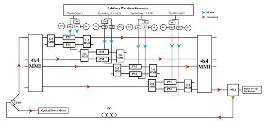 - Hasan, M.; Hall, T.J. Photonic circuit for high order USB and LSB separation for remote heterodyning: Analysis and simulation. Opt. Express 2015, 23, 25259–25271. [Google Scholar] [CrossRef] [PubMed]