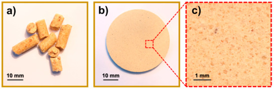 Commercially available soybean grist was purchased from Rusagro LLC (Tambov, Russia). The grist was milled in a milling machine (JSM 100, Herzeg, Nattheim, Germany) for 5 min and then the material was pressed into pellets under a load of 150 kN (Retsch PP25, Haan, Germany). A photograph of the grist pellets can be seen in Figure 2. After creating the pellets, they were analyzed with an X-ray fluorescence spectrometer (ARL 9900, Thermo Fisher Scientific, New York, NY, USA) [42], which revealed a low concentration of Zn (Table 1).