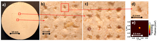 Photograph of the soybean grist tablet surface after LIBS mapping (a), and a more detailed view of the craters (b,c), single laser crater photo (d), and laser beam spot (e).