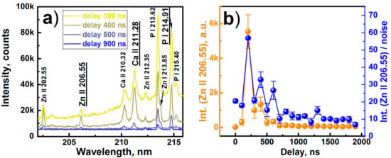 The optimal choice of LIBS spectral lines depends on a number of factors, including detector sensitivity, line intensity, the possibility of self-absorption, and spectral interference. Additionally, it is conventional to use an internal standardization procedure to compensate for pulse-to-pulse variations in the amount of ablated matter and in the excitation characteristics of plasma. In this study, we focused on zinc analysis at a low concentration, so we needed the strongest lines but not to spectrally interfere with the atomic/ionic lines of major elements or molecular bands; for this reason, we chose the spectral region at 200–220 nm, where resonant ionic and atomic lines are present: Zn II at 202.55, Zn II at 206.20, and Zn I at 213.86 nm. Additionally, calcium Ca II 210.32, Ca II 211.28, and phosphorus P I 213.62, P I 214.91 lines were observed in the spectrum. The most intensive zinc line Zn II 213.85 nm cannot be used as a signal (spectral line integral corrected for background) due to spectral interference with the P I 213.62 nm line. The evolution of laser-induced plasma spectra has been studied to reveal the optimal conditions for spectra acquisition. Plasma emissivity decreased rapidly within the first five microseconds (Figure 4), so the early moments of plasma emission were optimal for LIBS spectra acquisition (gate 1 us, delay 0.2 us) due to a better signal-to-noise ratio for Zn lines.