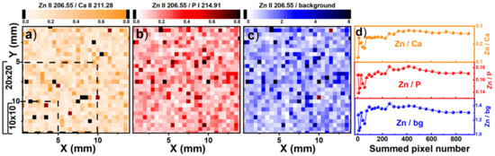 Zinc intensity (Zn II 206.55 nm) maps normalized on calcium Ca II 211.28 nm (a) and phosphorus P I 206.55 nm (b) lines and background intensity (c). (d)—Normalized zinc intensity, averaged by increasing area dimensions or increased sampling spot number (e.g., 10 × 10 square = 100 spots).