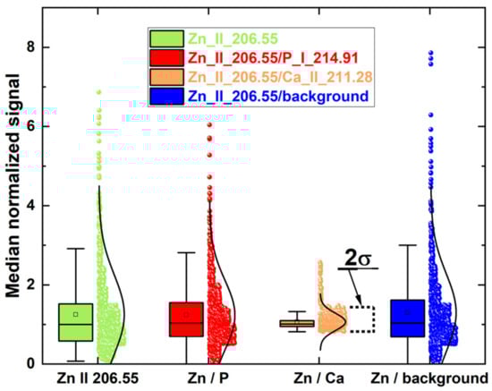 In order to estimate the minimal sampling area needed for representative analysis, we have totaled the points in Figure 6a–c to achieve squared areas of different dimensions. Normalized signals had poor reproducibility but, after averaging over 300–400 pulses, the signal stabilized (Figure 6d). A better-normalized signal convergence was determined when normalizing on Ca II 211.28 nm, so it was convenient to use the Zn II 206.55 nm/Ca II 211.28 nm ratio for the construction of the calibration curve. To study this in detail, we have drawn normal box graphs for the Zn II 206.55 nm line intensity, as well as the signal normalized by phosphor, calcium lines and background level intensity. In order to compare the distribution function of normalized signals, we have also normalized such data by median normalization. According to Figure 7, the narrowest distribution was achieved when the normalization on the Ca II 211.28 nm line was chosen. Additionally, all normalized signal values beyond 2*sigma were considered as outliers, so data were conditioned before the calibration curve construction step.
