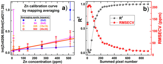 Calibration curves for zinc with a different number of averaging spots have been constructed and are presented in Figure 8a. The calibration curves were fitted by linear functions. For viewability, only a few of the calibration curves are shown. LIBS analytical capabilities were compared in terms of precision, calibration curve linearity and analytical accuracy. The accuracy of the analysis was estimated by the leave-one-out cross-validation procedure, with the root mean square error of cross-validation (RMSECV) as the main index, estimating the calibration model performance: where ci—predicted concentration, ciref—reference concentration, and n—number of calibration samples.