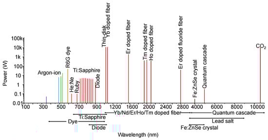 Ion-lasers, Ti: Sapphire, dye, and semiconductor diode lasers are the most common commercially available continuous-wave (CW) lasers used for the visible spectral range [3,4,5,6,7,8,9]. However, the output power of single-laser sources is mostly limited to tens of watts. In near-IR spectral range from 1 to 2.5 µm, thin-disk lasers and rare earth doped-fiber lasers (such as ytterbium (Yb), erbium (Er), thulium (Tm), holmium (Ho)) are the prominent light sources providing extremely high powers with nearly diffraction-limited beam quality [10,11,12,13,14,15,16,17]. A Yb:YAG single-disk has delivered about 12 kW of CW output power at 1030 nm [13], whereas a single Yb-doped fiber has achieved about 6 kW of output power [18]. IPG Photonics offers commercial Yb-doped single-mode fiber of about 10 kW at 1074 nm with a beam quality of M2 = 1.05 [19]. Despite the availability of exceedingly powerful laser sources, there are still significant voids in this spectral region, particularly the “eye-safe” wavelengths from 1.4 to 1.8 µm. It is also evident from the figure that there are fewer sources catering to UV and mid-IR regions. The current mid-IR light sources are quantum-cascade semiconductor lasers, lead salt lasers, lasers doped with trivalent rare-earth ions, Cr:ZnS(e) and Fe:ZnS(e) lasers [20,21,22,23]. However, these lasers are limited in their spectral tunability, output power, and low beam quality.