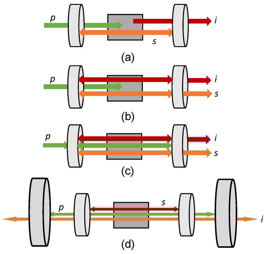 OPO laser (a) SRO, (b) DRO, (c) TRO, and (d) intracavity configurations; p, s, and i denotes pump, signal, and idler wavelengths respectively.