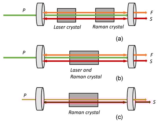 Raman laser (a) intracavity, (b) self-Raman, and (c) external cavity configurations; P, F, S denotes to pump, fundamental, and first Stokes respectively.