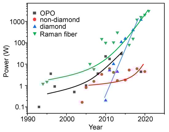 Non-linear optics, in the form of second harmonic generation (and its derivatives of higher harmonics) [34], sum- and difference-frequency generation [35,36], parametric amplifiers [37], and stimulated Raman scattering (SRS) [38] help fill in some of the “gaps” in the spectrum, but with increased complexity and reduced efficiency [39,40,41]. OPOs and Raman lasers are two common sources that utilize nonlinear optical processes to access new spectral regions of interest. Sometimes, these lasers can employ other nonlinear processes such as frequency doubling and tripling, sum and difference frequency generation to access more wavelengths [42]. OPOs are attractive coherent light sources for producing narrow-linewidth, broadly tunable wavelengths from visible to the mid-IR [43,44,45,46]. Owing to thermal lensing in the gain media, these lasers were able to generate CW output power ranging from milliwatts to watts [43,47]. On the other hand, Raman lasers provide a practical alternative to OPOs as they do not require birefringent crystals or quasi-phase-matching conditions [48]. They are also efficient frequency converters generating high CW output powers and high brightness [49,50,51]. Recently, a quasi-CW DRL delivered 1.2 kW of output power at 1240 nm [52].