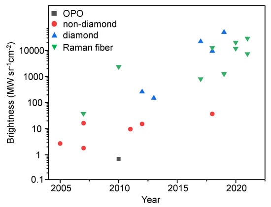 As already discussed, power enhancement also brings in an additional requirement of good beam quality. The brightness of the nonlinear lasers over the past decade is calculated according to Equation (1), and is illustrated in Figure 6.