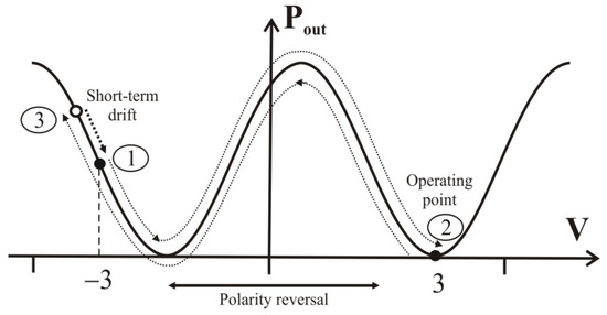 When polarity changes, output optical power corresponding to the operating point position on the transfer function of EO-modulator changes abruptly (Figure 4). However, the operating point moves to a position that does not correspond to the switching voltage. Accordingly, some relaxation time of the operating point is necessary in order to return to the required position. Figure 4 shows a double voltage switching circuit. After the first switching voltage (position 2, operating point was fixed during 5 min), the second switch of the voltage and the operating point should return to the initial position −3 V. However, the operating point jumped to position 3, which does not correspond to −3 V. There is a certain pattern where the operating point almost always proceeds further than necessary and then returns to initial position 1, which is clearly visible in Figure 3.